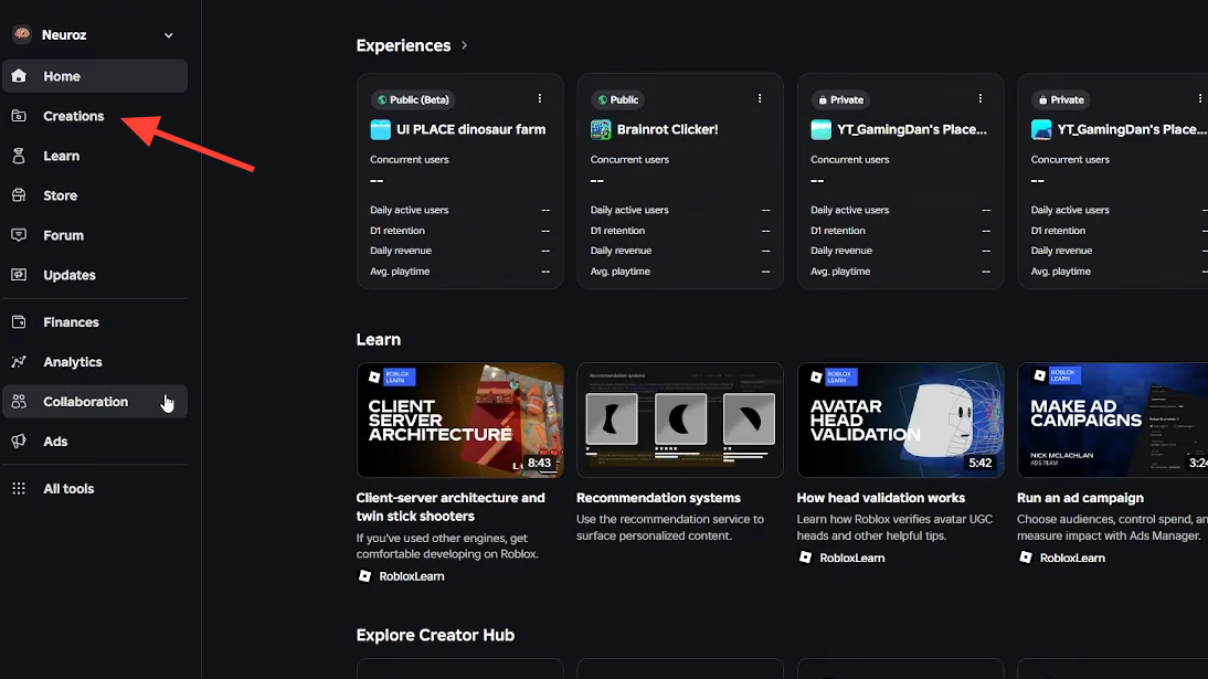 Step 1: Go to the Roblox Creator Hub and sign in. In the left sidebar, click Creations, then open the Development Items tab and pick Decals.