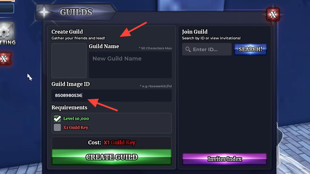 Step 3: Type your guild name in the Guild Name field. Then, click the Guild Image ID field labeled "Please paste asset ID here" and paste the decal asset ID you copied.