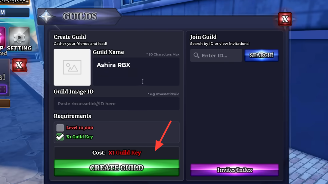 If you don't want to farm the key, joining an existing guild costs nothing. Open the Guilds menu, enter a guild ID, and hit Search. Send a join request, and the guild admin accepts it. Invites from other players also land in the Invites Index, where you can accept them directly.