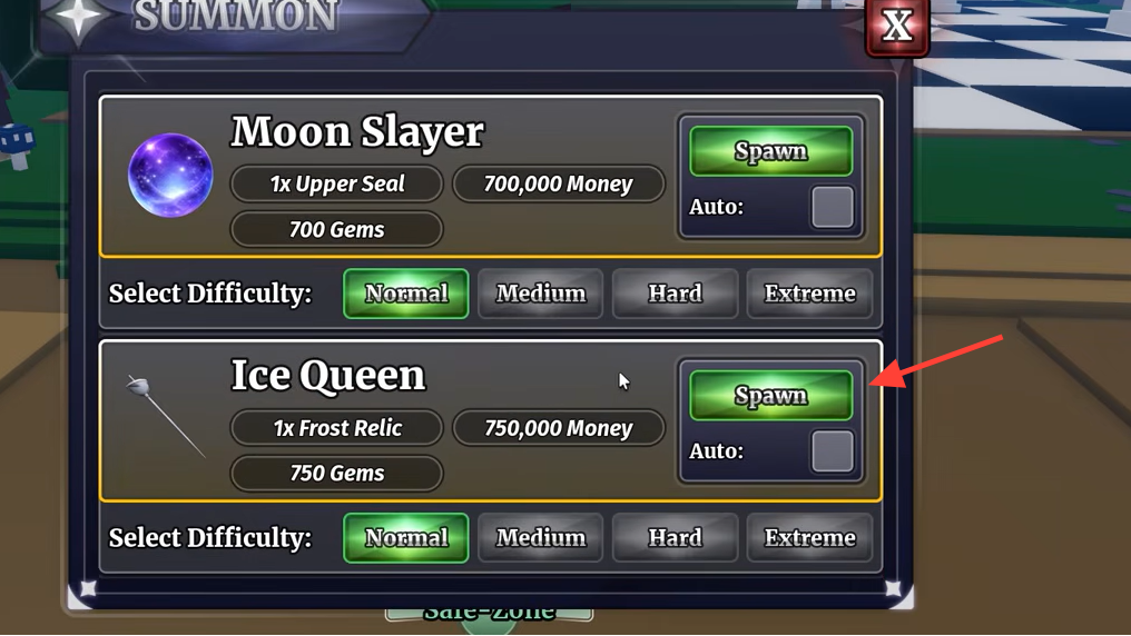 Step 4: Travel to Boss Island via the portal, interact with the Boss Summoner NPC, and spawn the Ice Queen on Normal difficulty. Once you've confirmed you can kill the boss in a few hits, enable auto spawn. Your character will continue summoning and defeating the Ice Queen without manual input, as long as you have enough Frost Relics in your inventory.