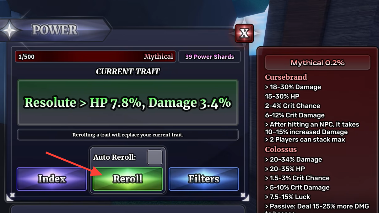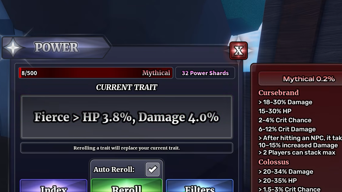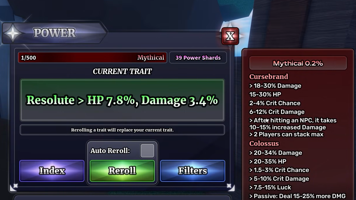 Every reroll pulls from the same probability table. Mythical Powers sit at a 0.2% chance, so expect to burn through a significant number of Power Shards before landing one.