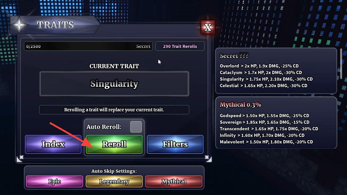 For Traits, Emperor, Celestial, Singularity, Cataclysm, and Overlord occupy the top tier. All five are Secret rarity, so realistically you should keep any Mythical Trait — particularly Malevolent (1.80x Damage, 20% Cooldown Reduction) — as a strong placeholder while continuing to reroll when you accumulate more items.