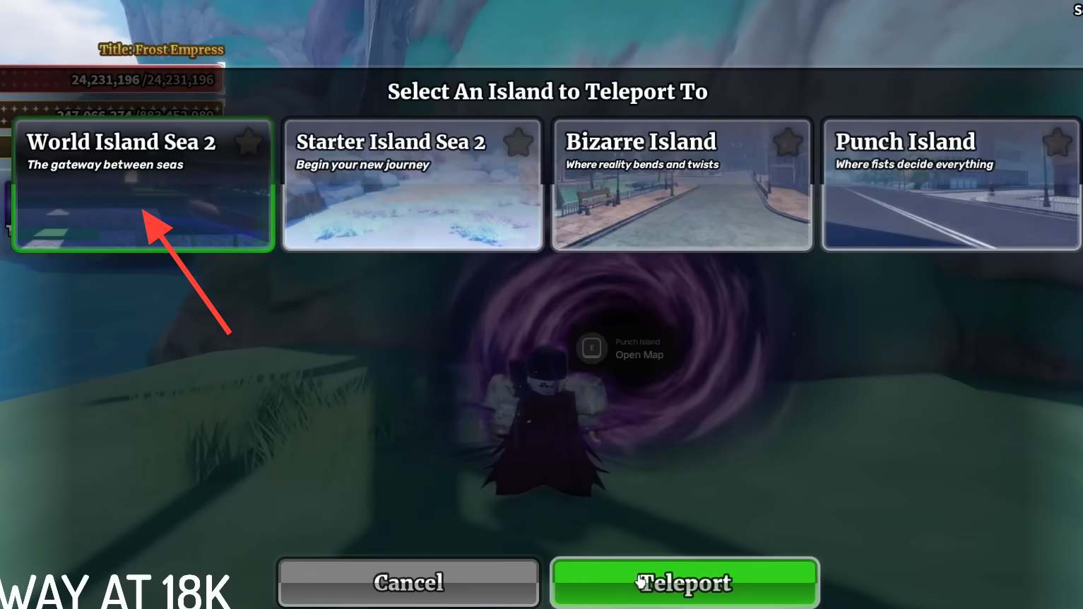 Step 1: Open your teleport menu from any island and scroll to the bottom of the list. Select World Island to travel there directly.