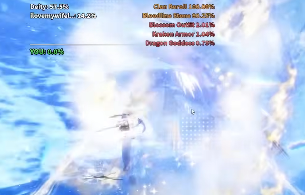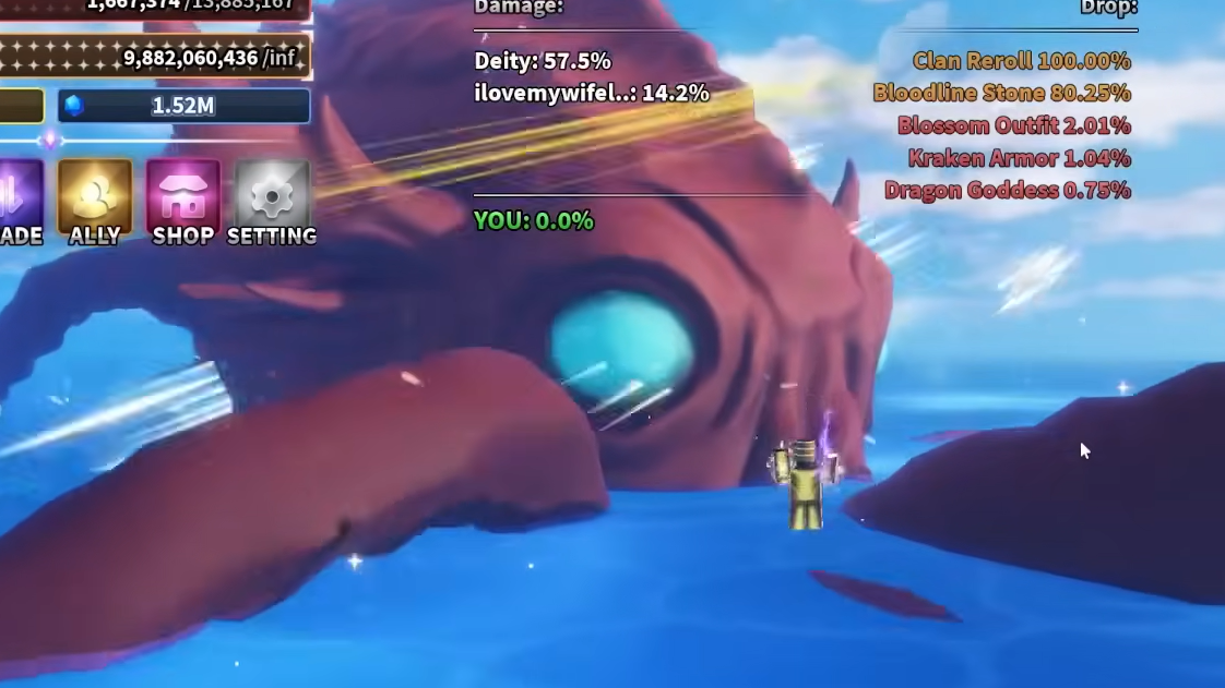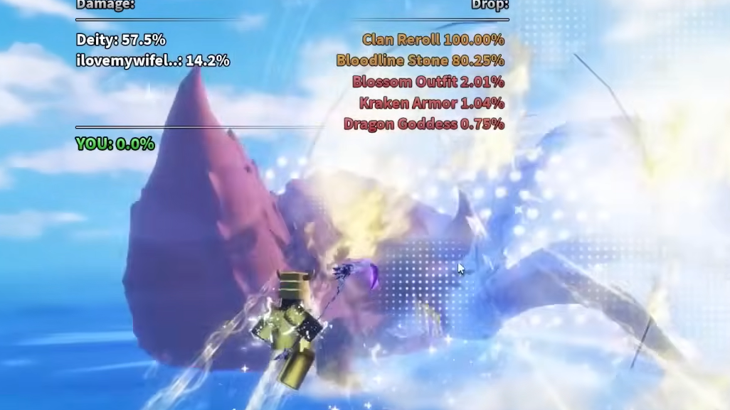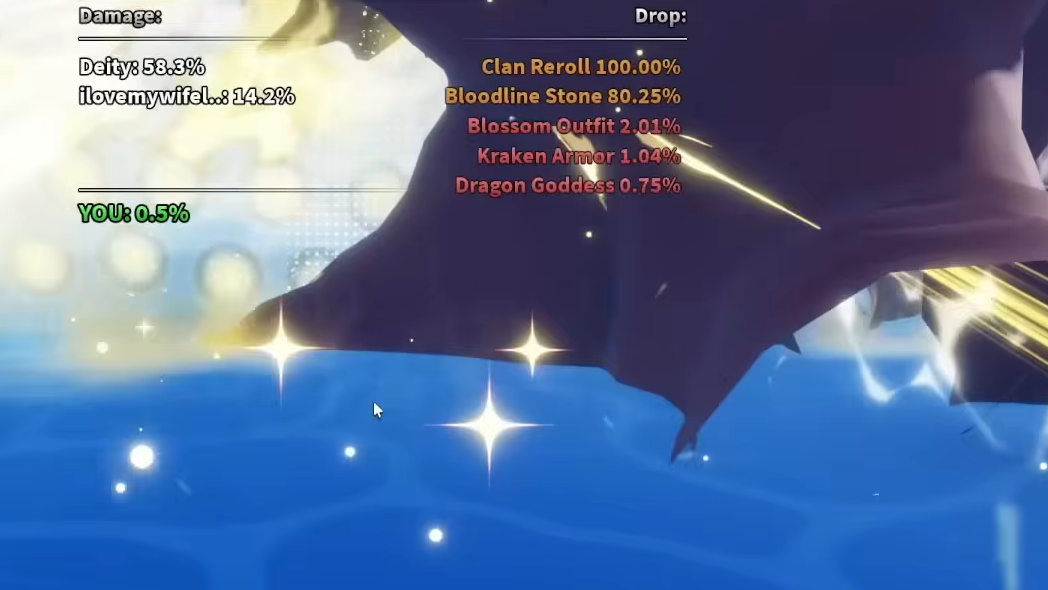 Dragon Goddess is the headline reward and the main reason most players farm these bosses. Kraken Armor and Blossom Outfit are cosmetic/gear side rolls, and the Bloodline Stone plus Clan Reroll are useful for anyone still shopping for a new clan.