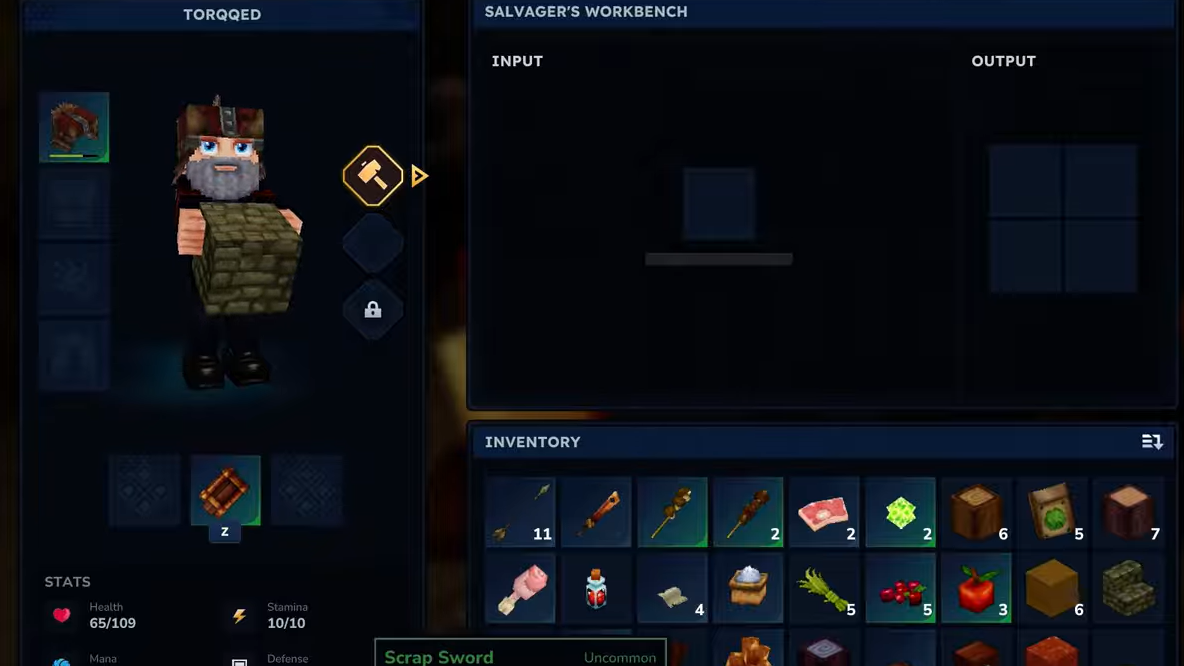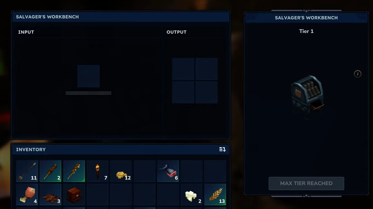 Interacting with the Salvager’s Workbench brings up a simple interface. In the middle, there is an input slot where you place items you want to break down. On the right, there is an output area showing the materials you will receive from the salvage.