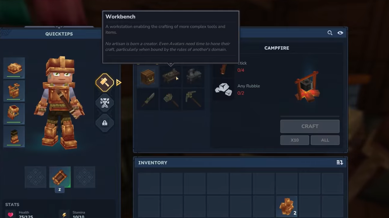 Once crafted, the Workbench must be placed in the world. You will also need it later as the interface for creating the Salvager’s Workbench.
