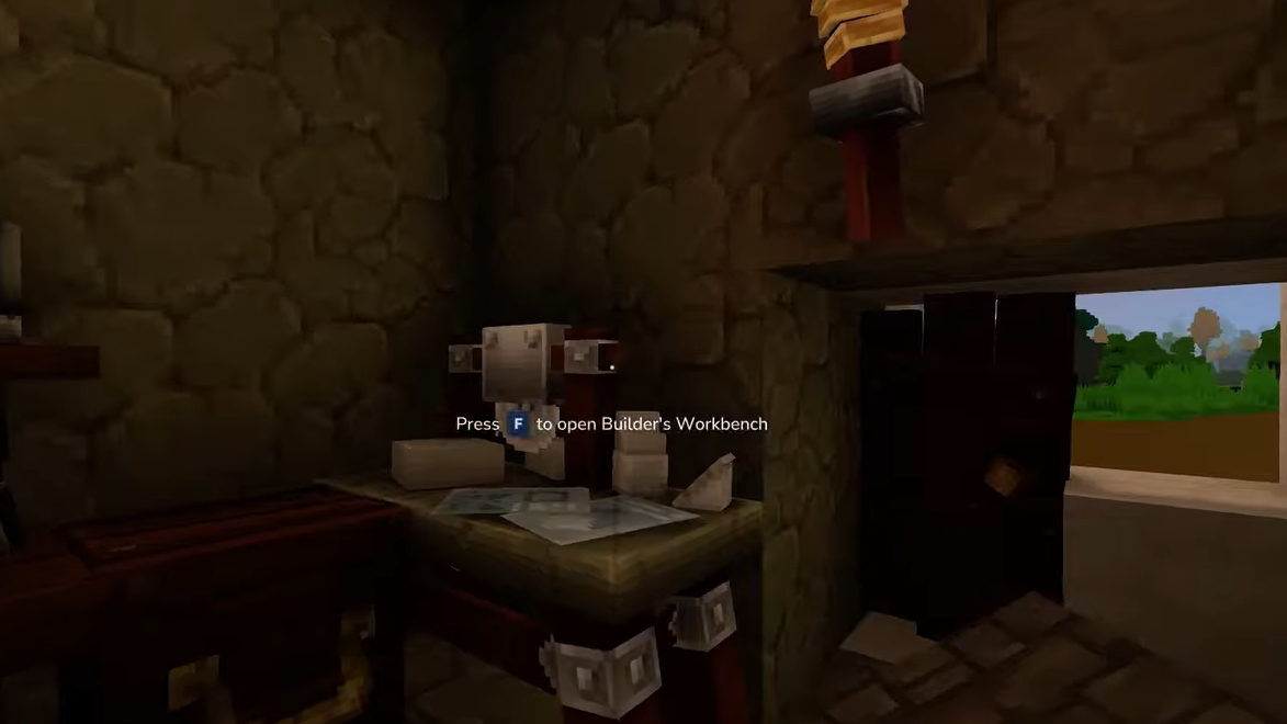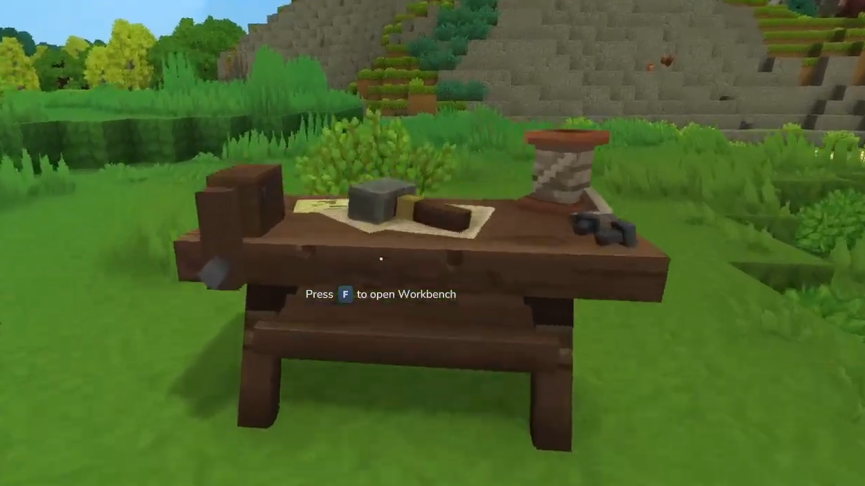 Step 3: Walk up to the placed Workbench and press F to interact. This opens a crafting interface with multiple pages of recipes, including other specialized workbenches.