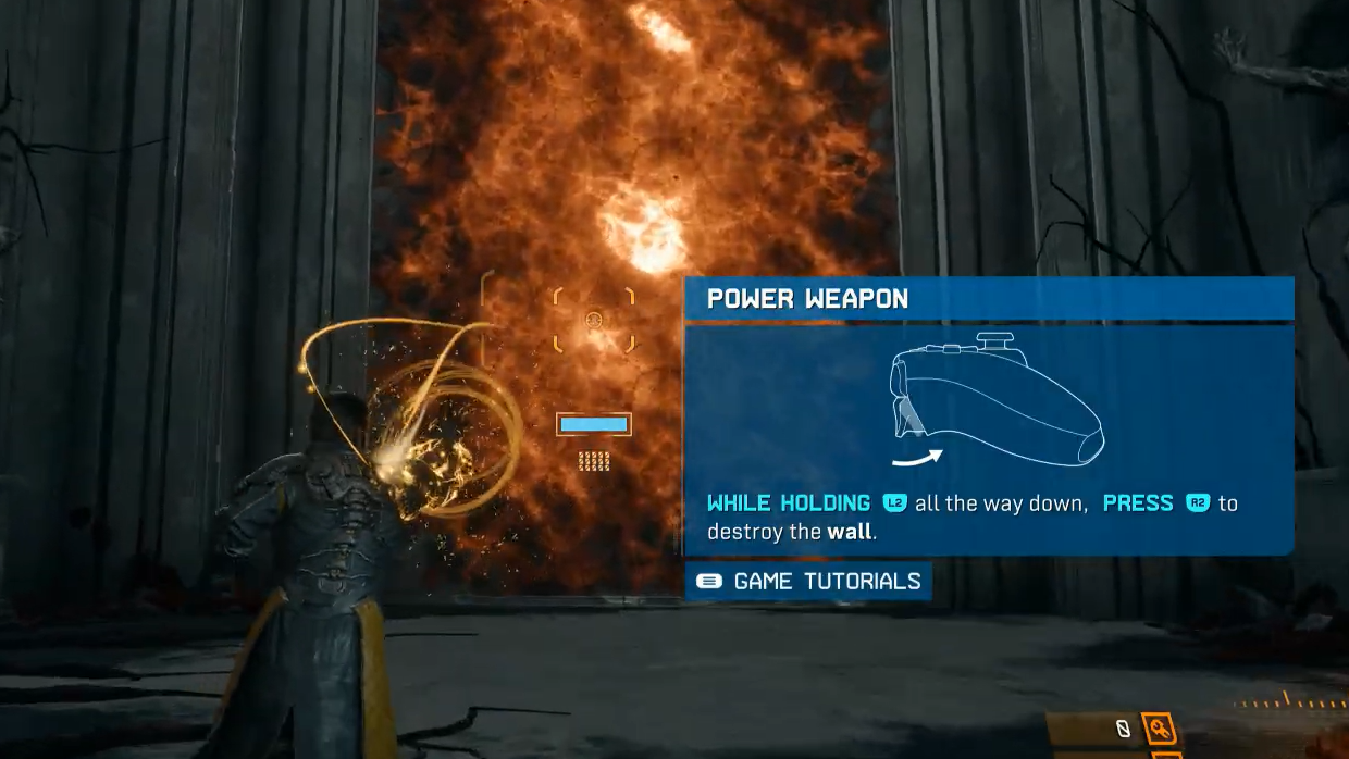 Step 2: While still holding L2, press R2 to fire. The blast travels forward and detonates on impact, capable of breaking the fiery doorway in the tutorial sequence and clearing tightly packed enemy groups.