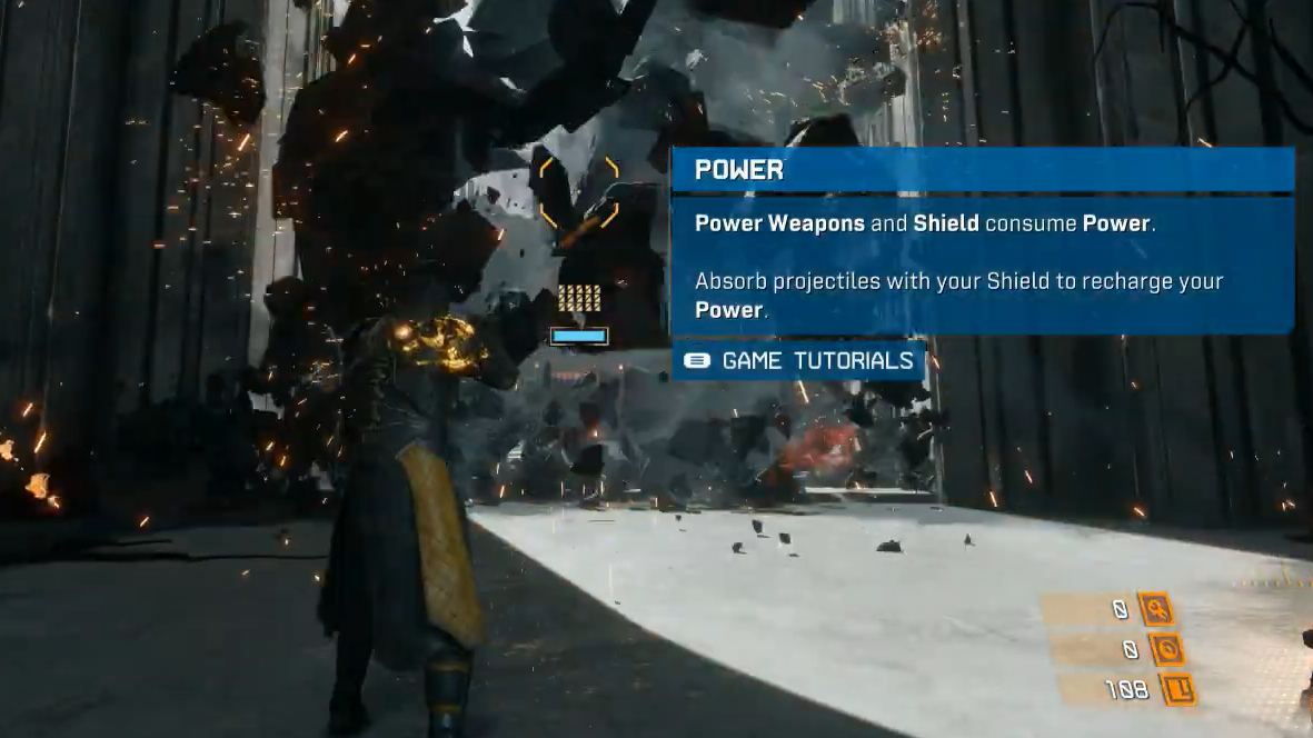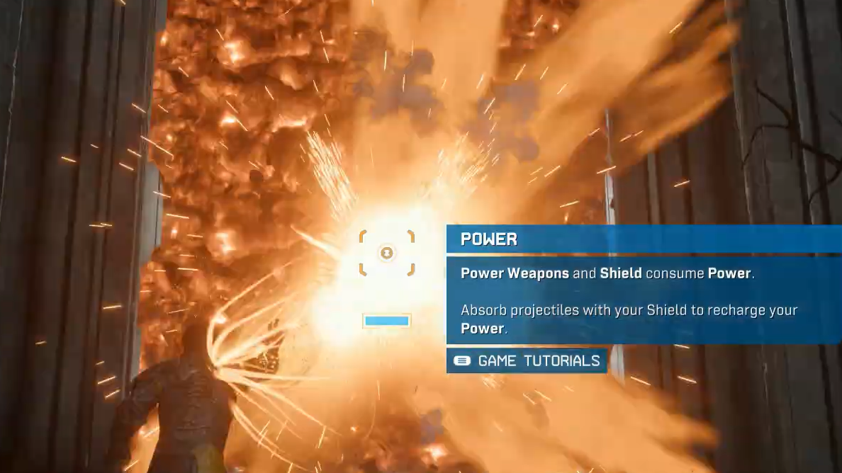 Power refills come from absorbing blue projectiles with the Soltari Shield. Raise the shield, stand in the path of incoming blue fire, and the bar climbs quickly as each round is converted into energy.