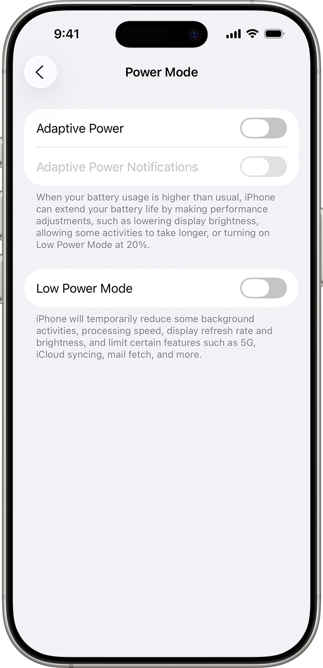 Adaptive Power is a system mode that predicts when you’ll need more battery and makes small, targeted adjustments to help a charge last longer that day. It can reduce screen brightness slightly, limit background activity, and automatically switch on Low Power Mode at 20%.