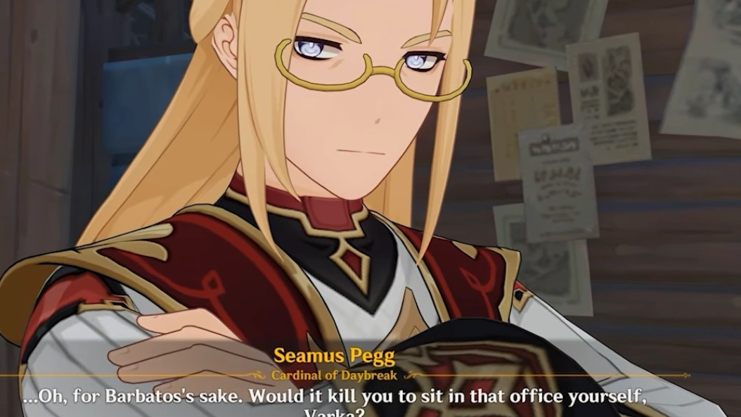 Quick answer: Seamus Pegg is Jean and Barbara's father, the Cardinal (formerly titled Seneschal) of the Church of Favonius, and one of Mondstadt's key leaders. He originally hails from Nod-Krai and was a famous adventurer before settling down. He appears as an NPC in the Luna VI patch.