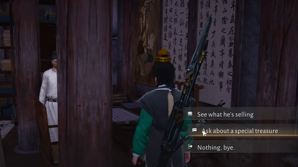 Step 2: Talk to Cao Sheng and choose the dialogue option that asks about a special treasure, then open the purchase view.