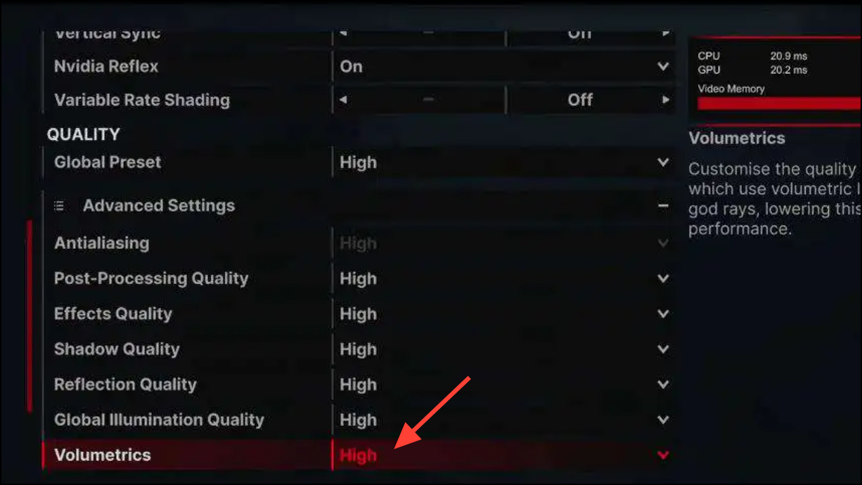 Lower Volumetric Effects (fog/smoke/atmospherics) to Low. Players frequently see big drops when the scene fills with volumetric fog or particle-heavy cuts. Lowering this setting reduces transient memory spikes and smooths frame times during scene transitions. If you prefer a middle ground, test Medium and watch the in‑game VRAM meter; if it nears capacity, step back to Low.