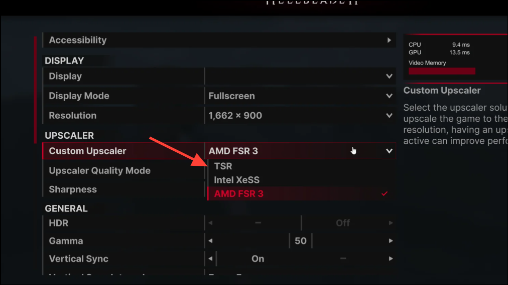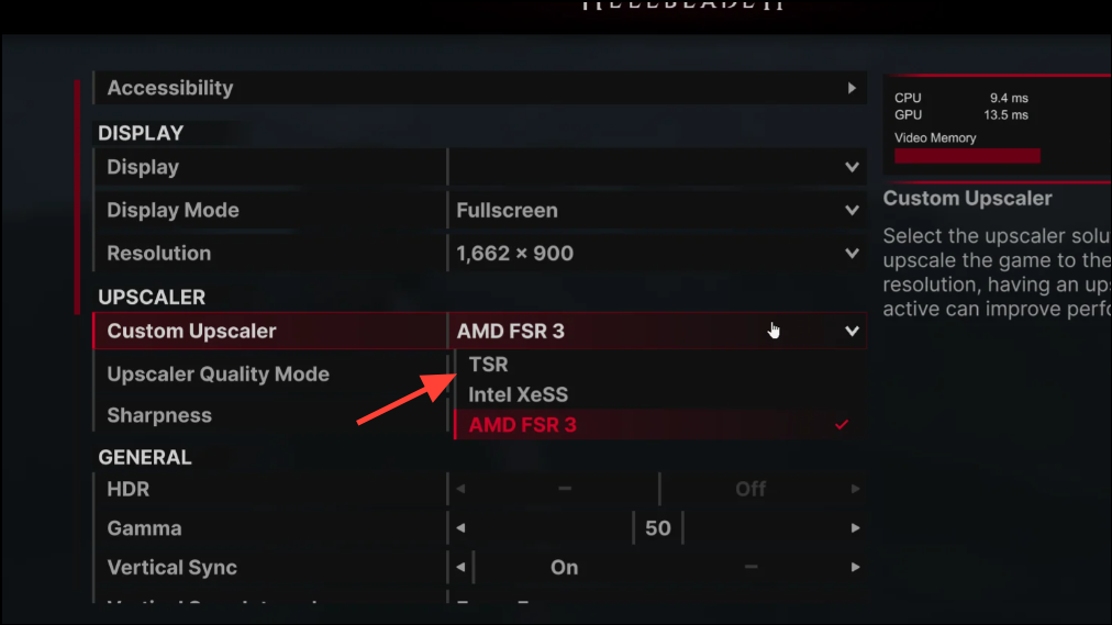 Switch the game’s upscaler to TSR for stability testing. Several users reported inconsistent behavior with DLSS/FSR in this title; TSR (the engine’s native temporal upscaler) can reduce micro-stutter on some setups. Use TSR Quality first, then Balanced if you still bump into VRAM ceilings. Monitor frame pacing after a few scene changes to judge the result.