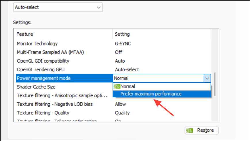 In NVIDIA Control Panel, set Power management mode to Prefer maximum performance for Hellblade2‑Win64‑Shipping.exe. Multiple users with 30‑series GPUs reported this immediately stopped dramatic dips in cutscenes and combat. Path: Manage 3D settings → Program Settings → add the game EXE → Power management mode → Prefer maximum performance. This keeps clocks high during scene transitions where the engine briefly idles, preventing aggressive downclocking.