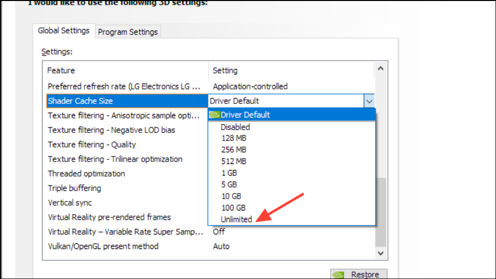 On NVIDIA, set Shader Cache Size to Unlimited. Open NVIDIA Control Panel → Manage 3D settings → Global or Program Settings → Shader Cache Size → Unlimited. A few players reported fewer stalls and smoother recovery from scene changes after lifting this cap. If you see no benefit or you’re tight on system drive space, restore the default value.