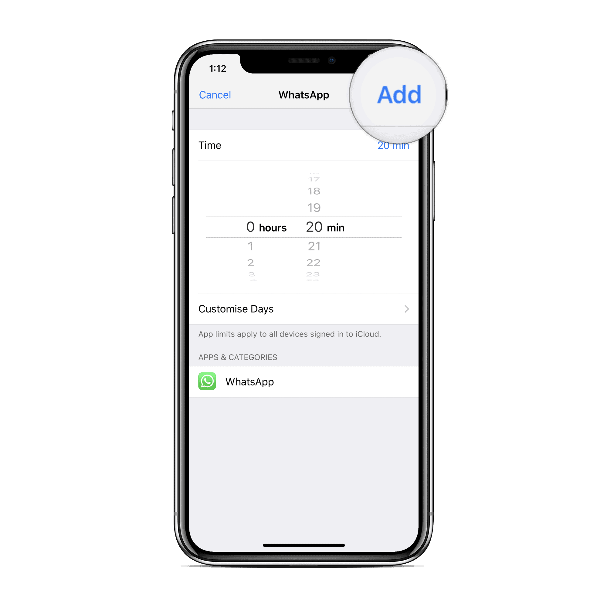 - Now select a category for which you’d like to add time limits, and tap Add on the top-right corner of the screen.