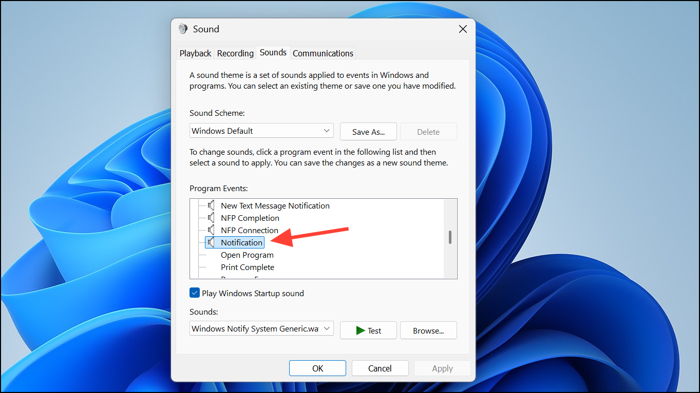 Step 3: In the Sound window, switch to the Sounds tab. Under Program Events, scroll to locate and select Notification. This entry controls the sound played for general notifications across Windows and many apps.