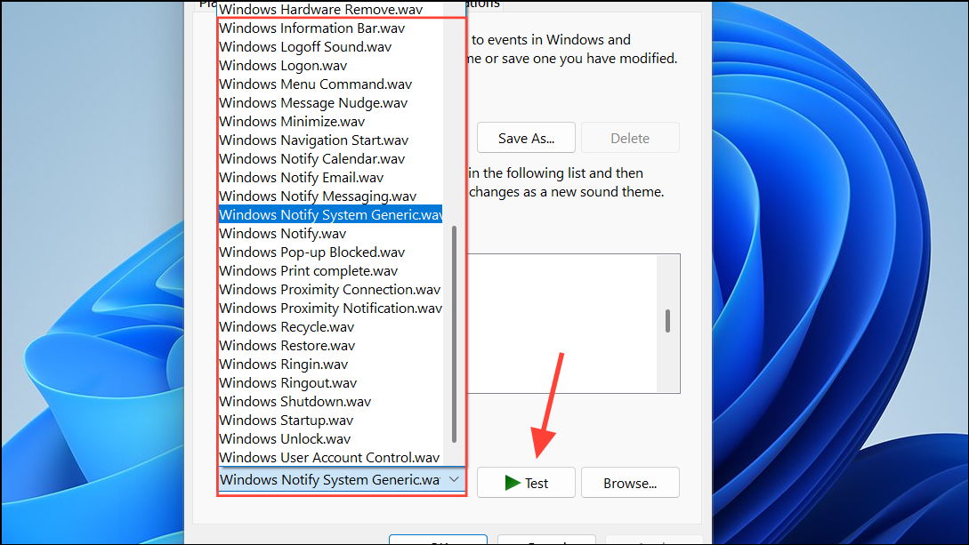Step 4: Use the dropdown menu at the bottom labeled Sounds to pick from the default .wav files provided by Windows. To preview a sound, select it and click Test. If you want to use your own sound, click Browse… and select a custom .wav file from your computer. Note that only .wav files are supported; if your sound is in a different format (such as .mp3), you’ll need to convert it first.