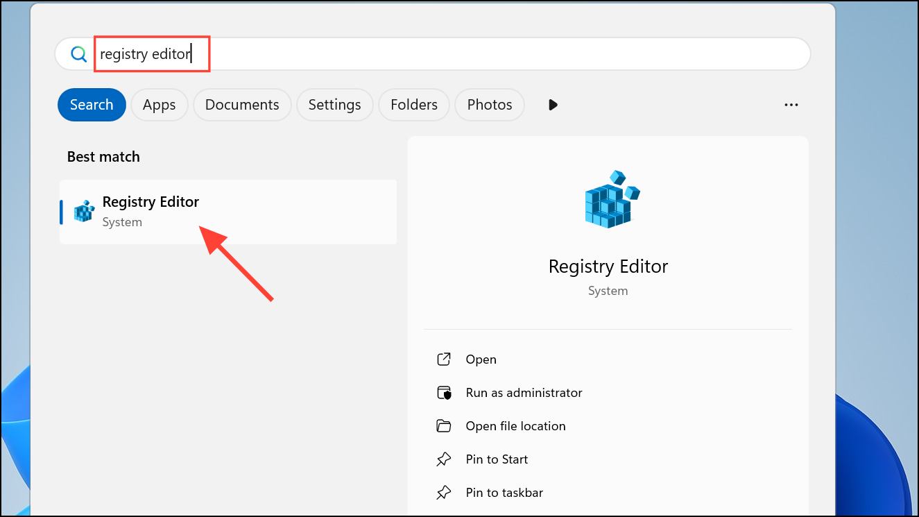 Step 1: Press Win + S to open the search bar. Type Registry Editor and select it from the results. If prompted by User Account Control, click Yes to allow changes.