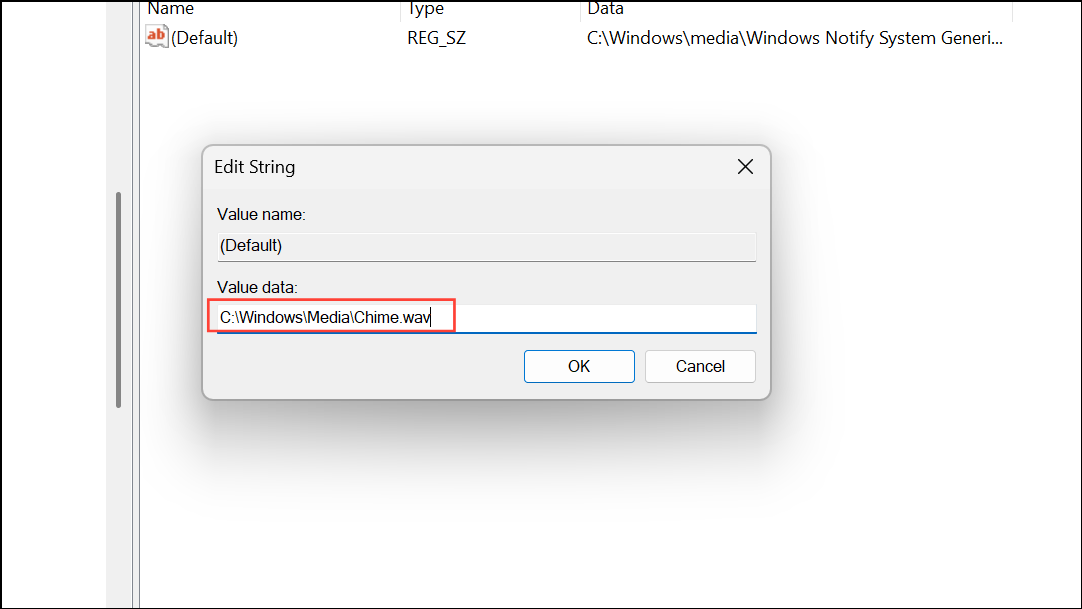 Step 3: Double-click the (Default) value in the right pane. Enter the full path to your custom .wav file (for example, C:\Windows\Media\Chime.wav) and click OK.