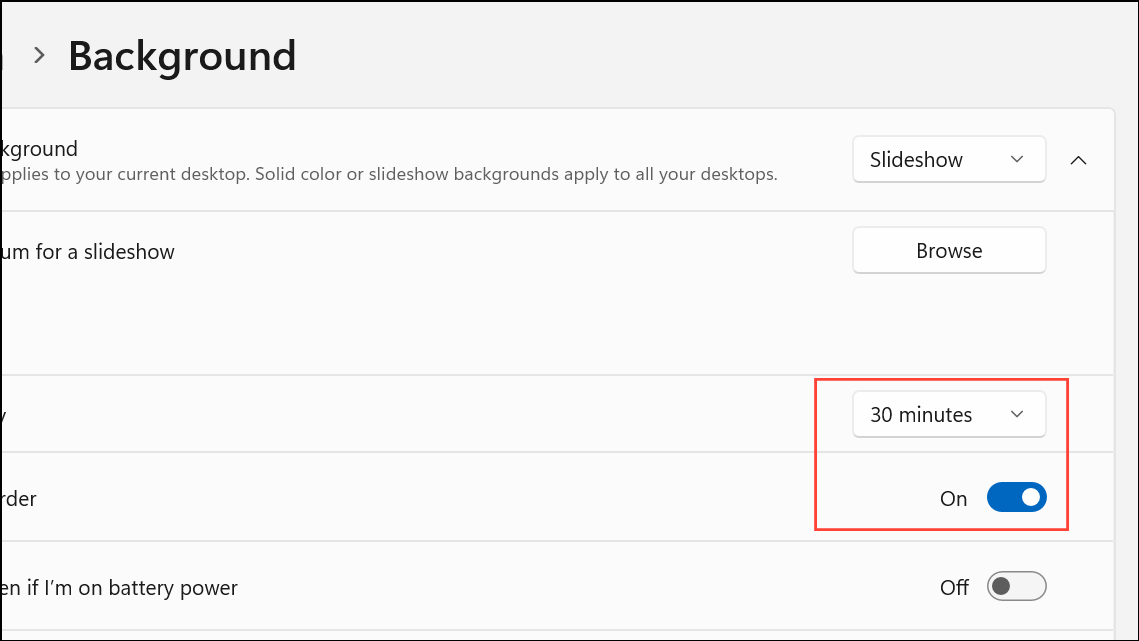 Step 5: Adjust slideshow settings such as Change picture every and Shuffle as needed. These control how often the images change and whether they appear in random order.