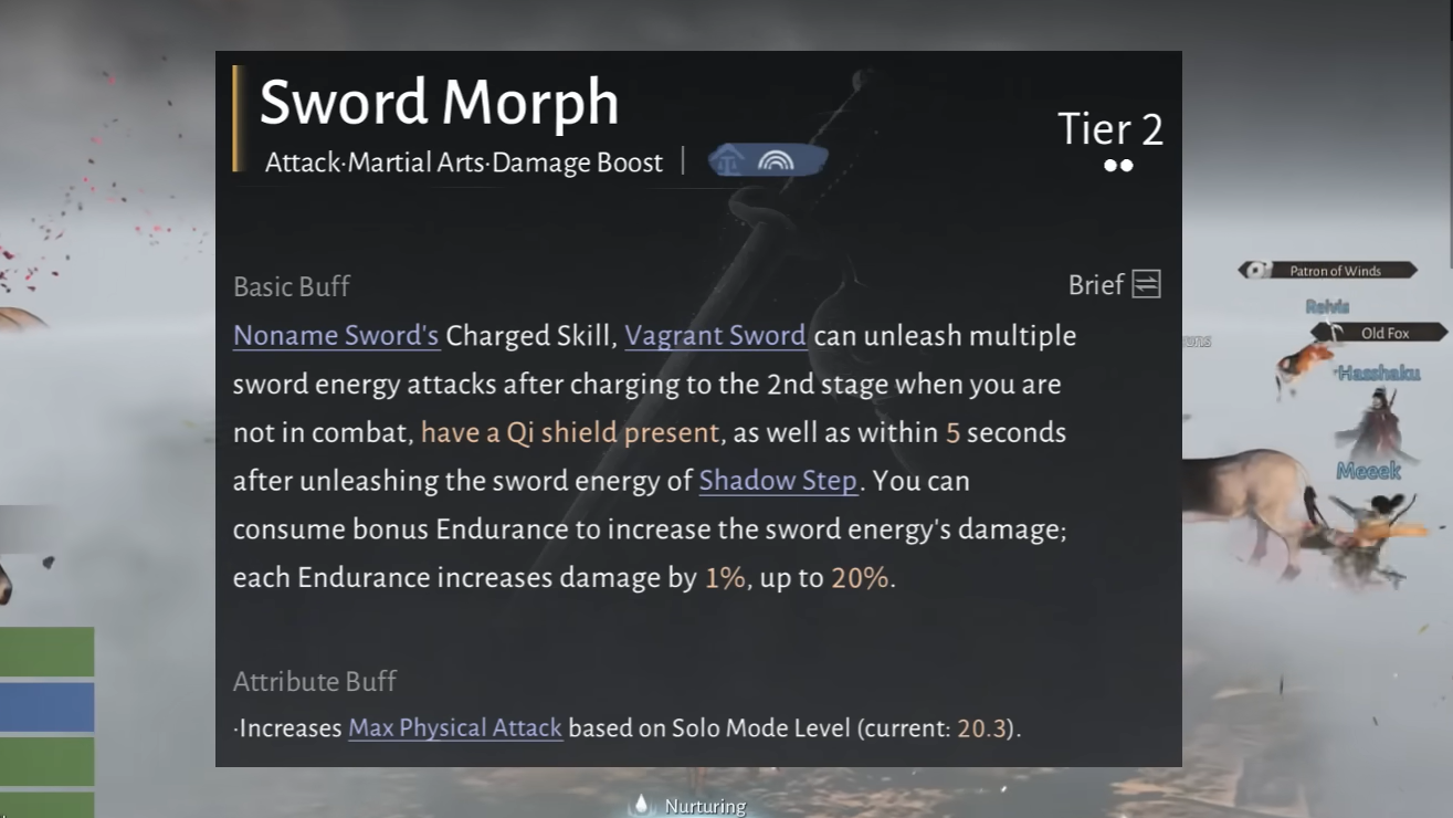The Inner Way Sword Morph is where Shadow Step becomes more than just a backstep. Sword Morph is an Inner Way that requires Nameless Sword or Nameless Spear on the Bellstrike – Splendor path. Its effect centers on the Nameless Sword’s Charged Skill (Vangrand Sword) and Qi shield, but player testing shows that it also has a conditional clause tied to Shadow Step: