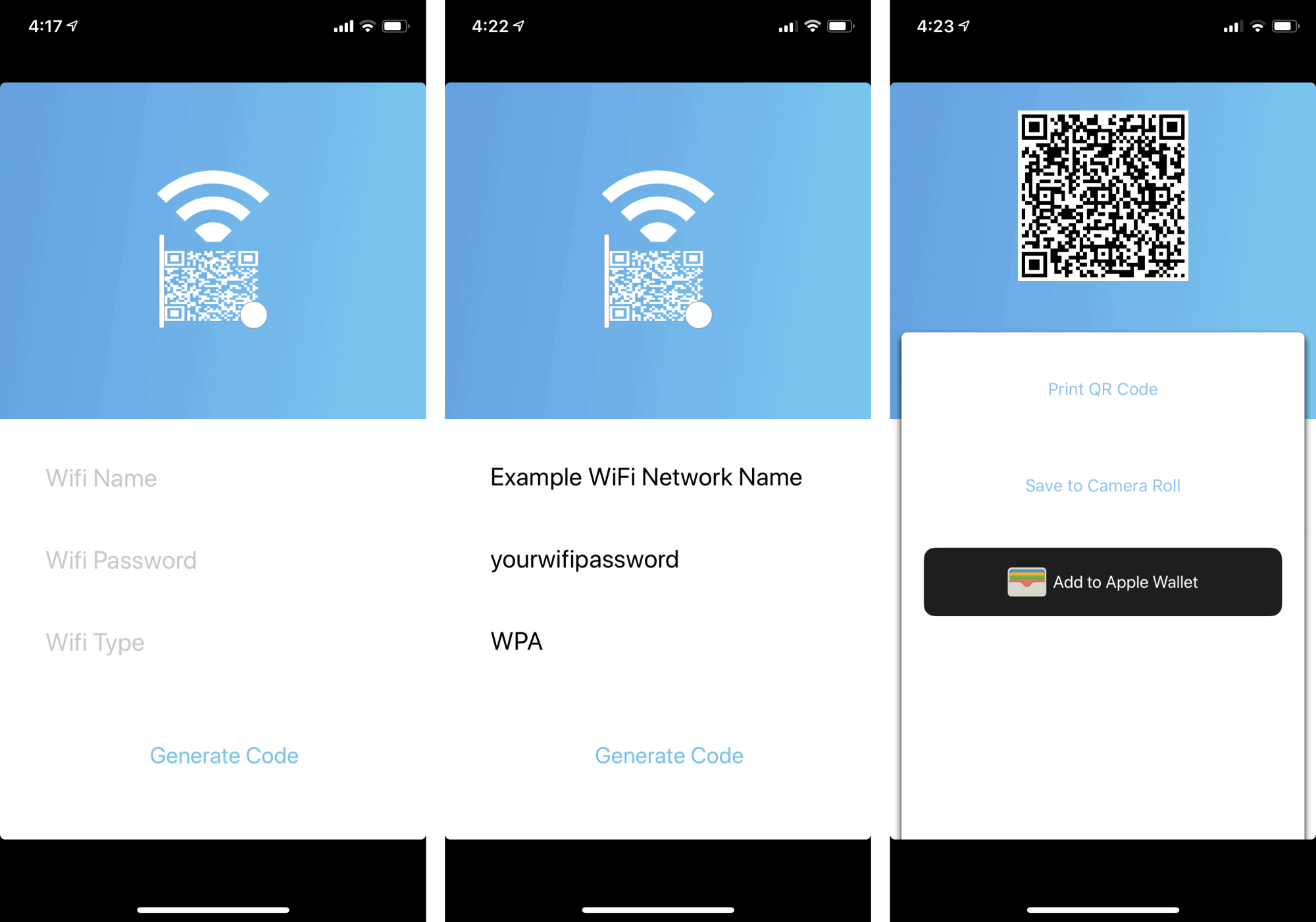 Open QR WiFi on your iPhone, input the WiFi Name, WiFi Password and WiFi Type in the app, and hit Generate Code button.