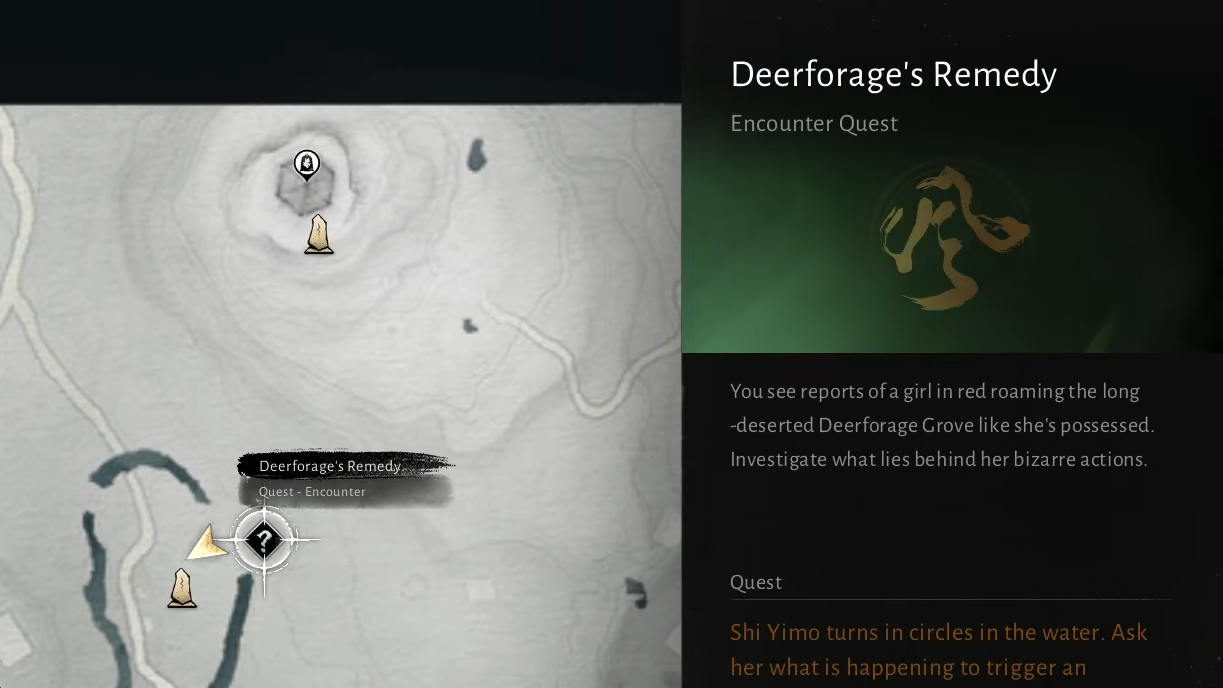 - Limit pending Encounters in your quest log. Players have reported that having two or more unaccepted Encounters sitting in the Encounter tab can block Deerforage’s Remedy from triggering. Dropping one made Shi Yimo appear immediately.
