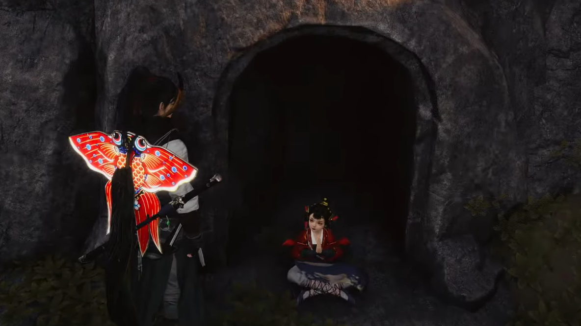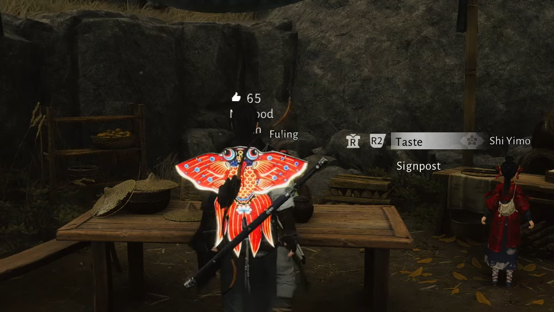 Step 1: After the healing, talk to Shi Yimo again and exhaust her lines about the treasure and the girl who inspired her. As you turn to leave and warn that girl, the camera reveals Fuling, another child standing next to the poisonous mushroom on the post.