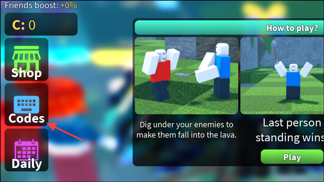 Step 2: Click the Codes button on the left side of the screen to open the redemption window.