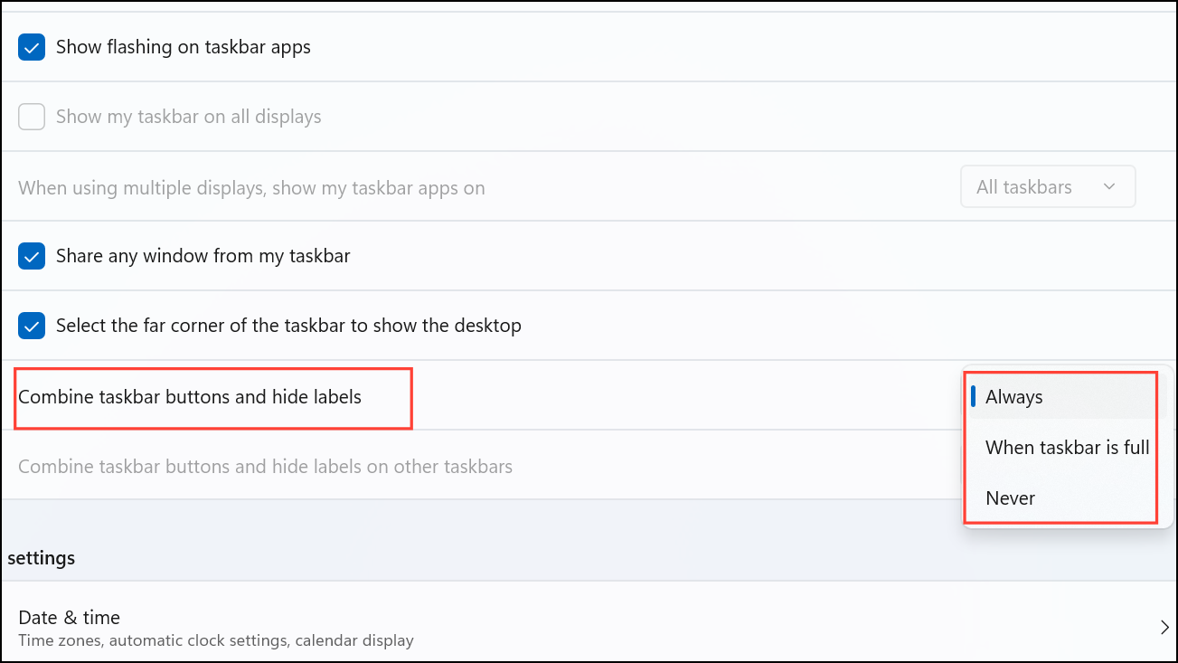 Step 4: Locate the Combine taskbar buttons and hide labels setting. Select your preferred option from the dropdown menu: