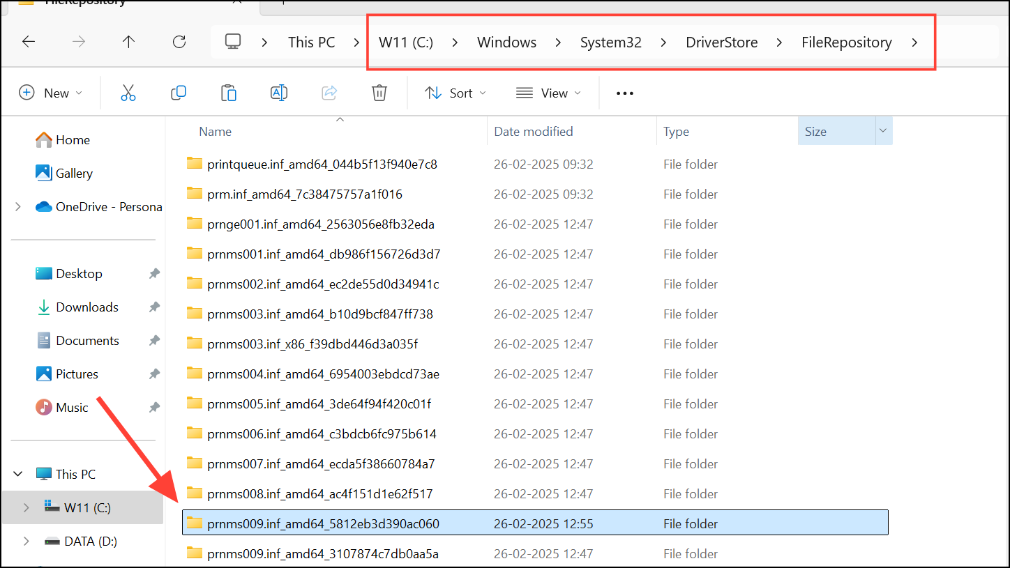 Step 1: On a working Windows 11 system (preferably the same or earlier build), navigate to C:\Windows\System32\DriverStore\FileRepository\ and locate the folder starting with prnms009.inf_amd64_. Copy the entire folder to a USB drive or network location.