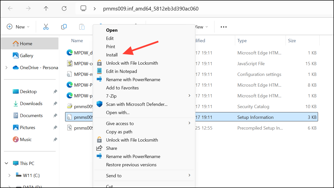 Step 3: Open the copied folder, right-click on prnms009.inf, and select Install. This action registers the driver with Windows.