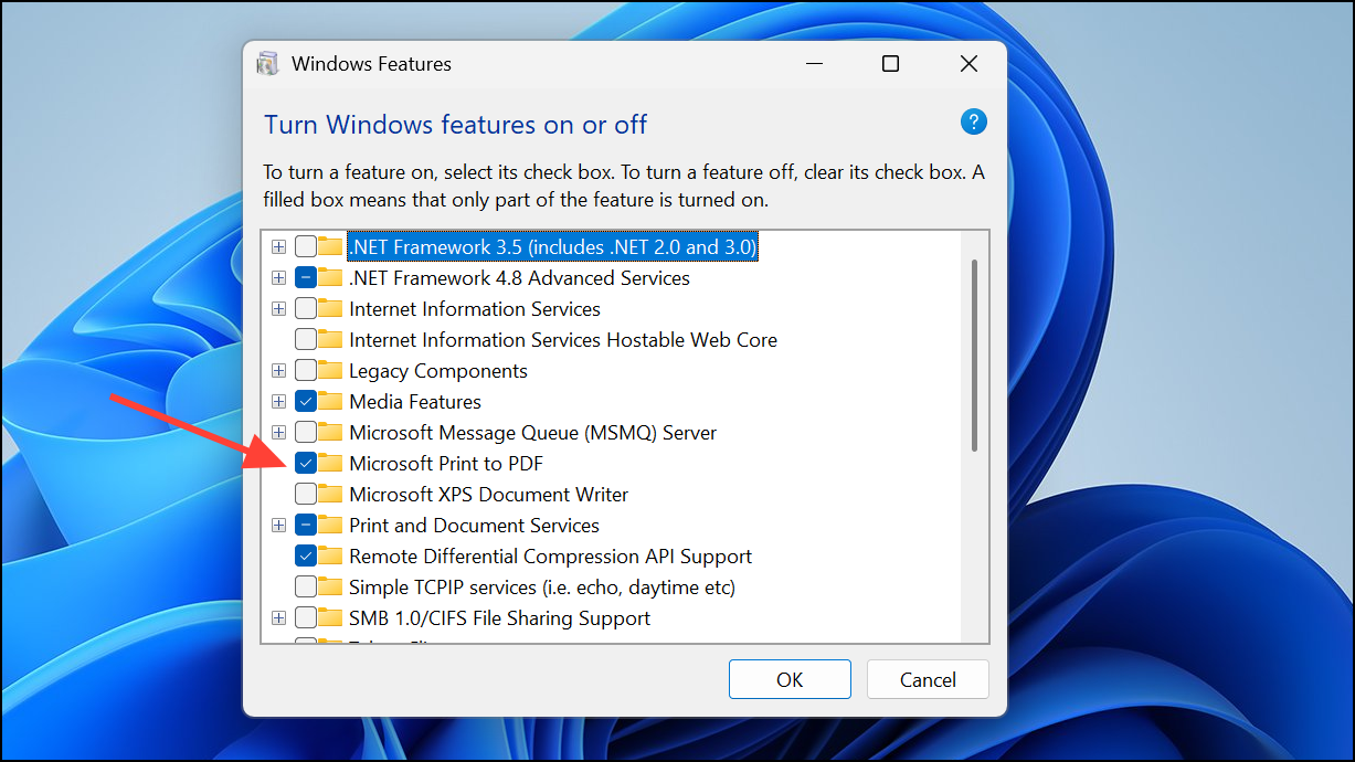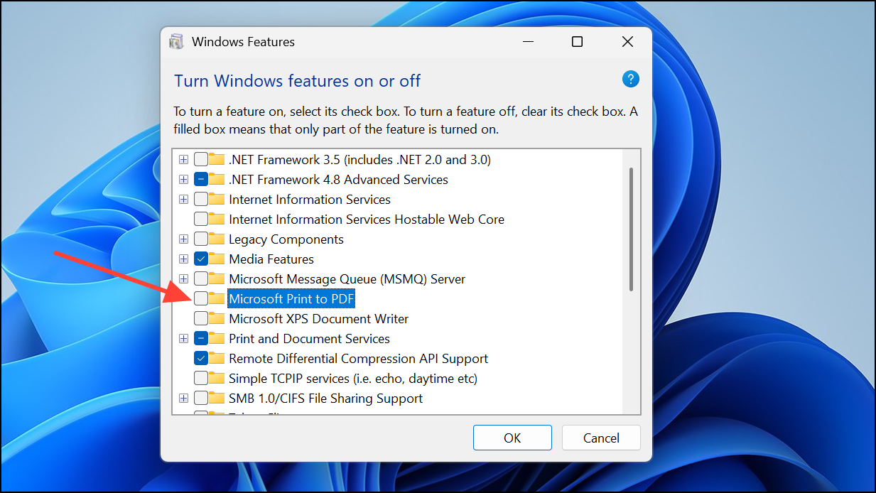 Step 3: Return to the Windows Features dialog, re-check Microsoft Print to PDF, and click OK. Restart again if required.