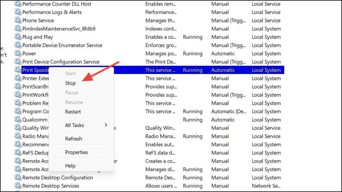 Step 6: Find Print Spooler, right-click, and select Stop.