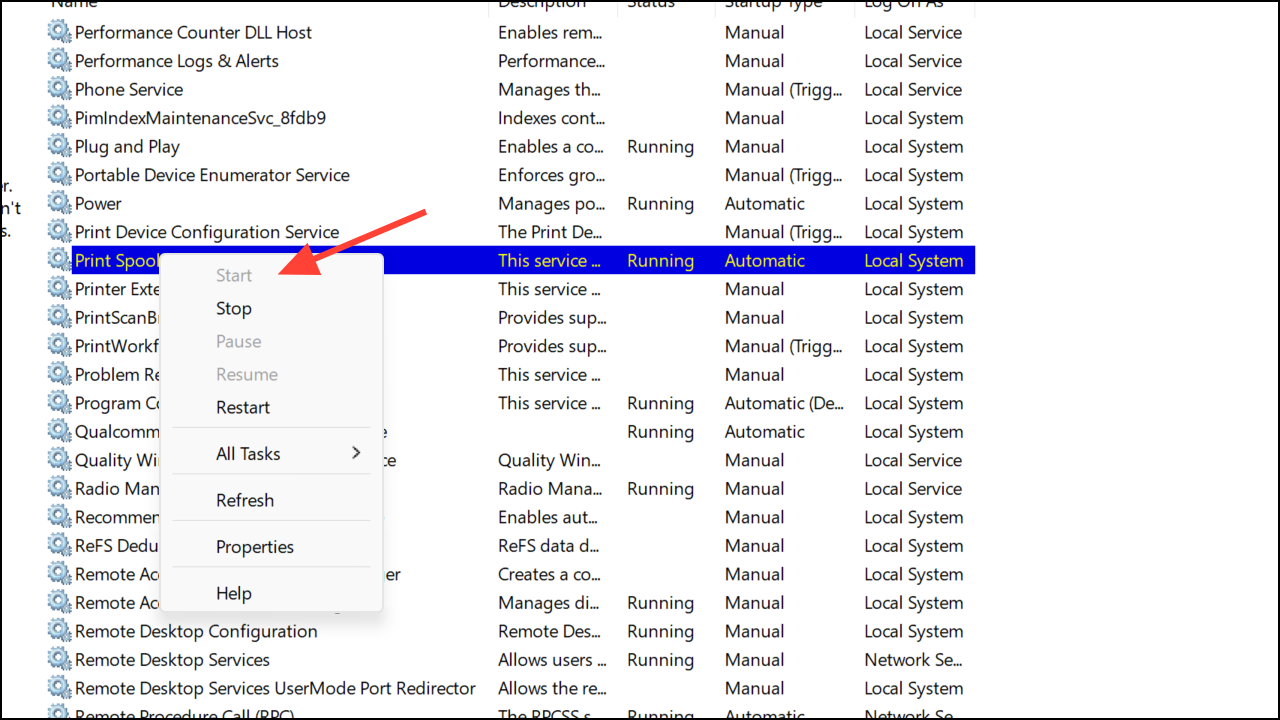 Step 8: In the Services console, right-click Print Spooler and select Start.