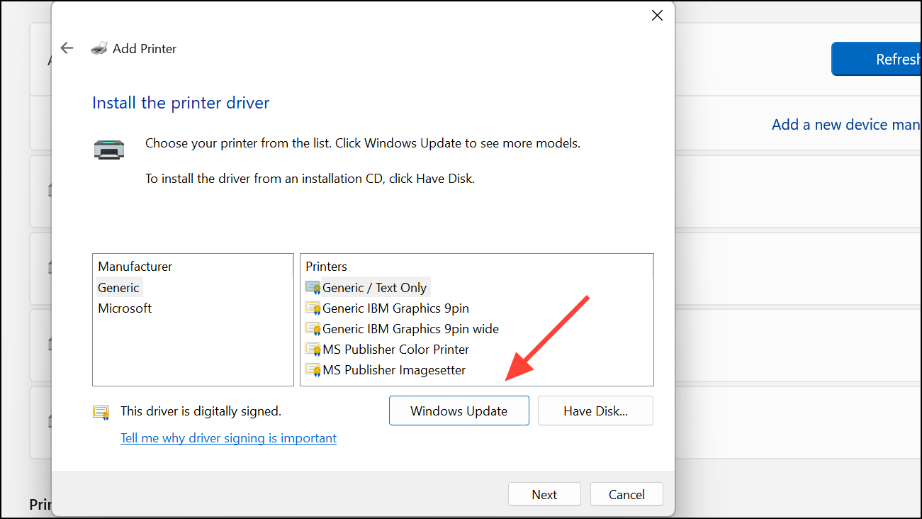 Step 5: When prompted to select a printer driver, click Windows Update and wait for the list to refresh. Once updated, select Microsoft as the manufacturer and Microsoft Print to PDF as the printer. Click Next and complete the wizard.