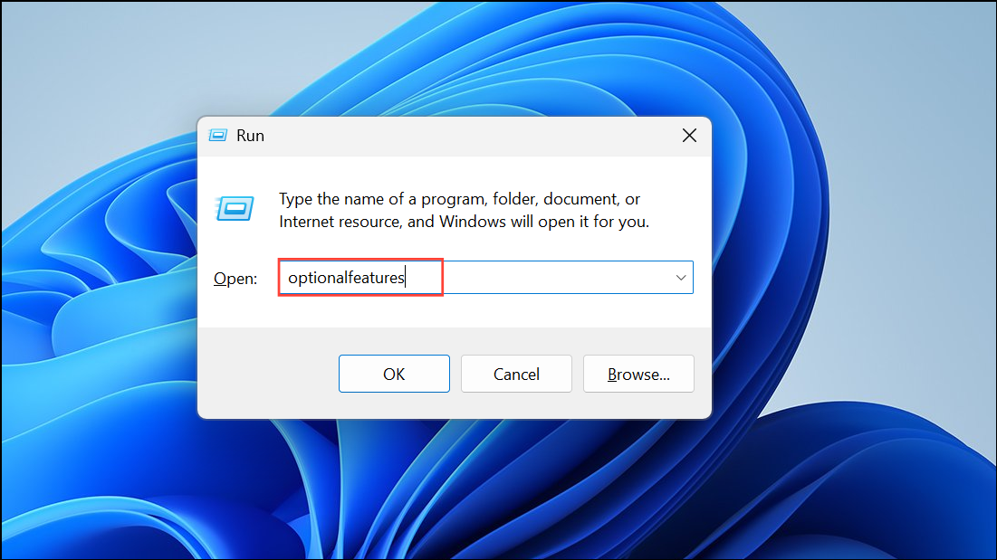 Step 1: Open the Windows Features dialog by pressing Windows + R, typing optionalfeatures, and pressing Enter.