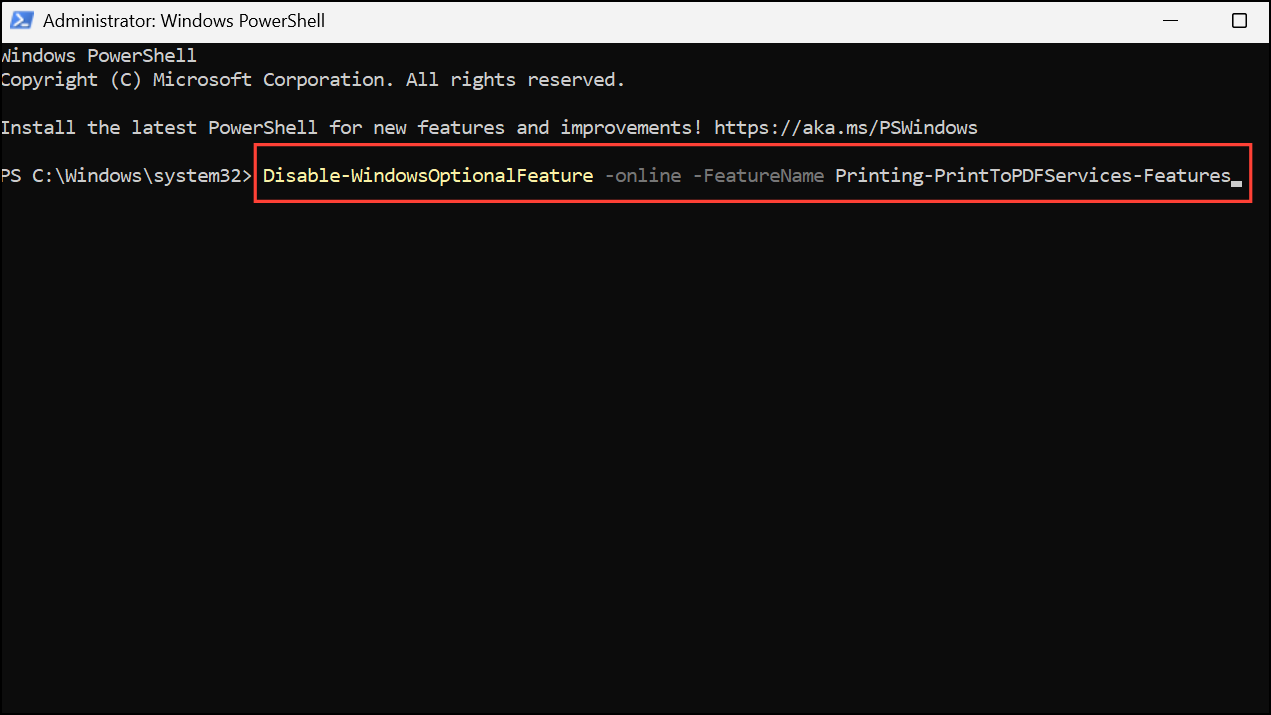 dism /Online /Disable-Feature /FeatureName:"Printing-PrintToPDFServices-Features" /NoRestart