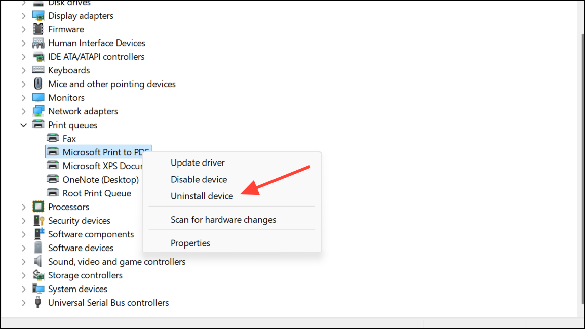Step 2: Expand Print Queues, right-click Microsoft Print to PDF, and select Uninstall device.