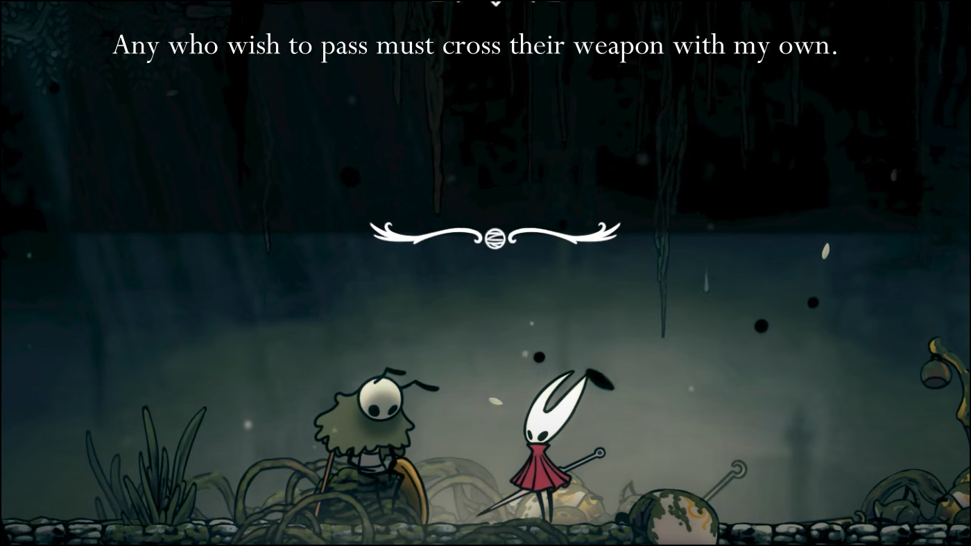Why it matters: few bosses in Silksong communicate so much with so little — a formal posture at the shrine, measured warnings in the flavor text, no tricks beyond absolute fundamentals. Beat him once and he steps into Pharloom as another traveler with history, not a wall on your way to one.