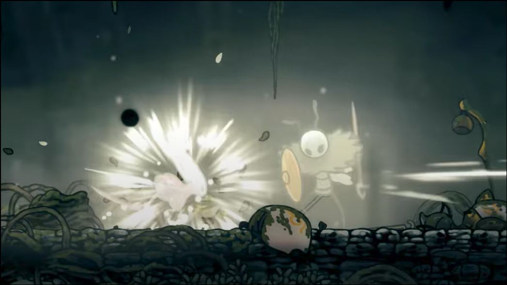 Seth’s kit revolves around two tools — the pin (offense, spacing) and the cymbal (defense, gap-closing). He frequently shifts guard to face Hornet, blocking attacks from the front or above depending on your position. Plan to bait, sidestep, and punish; his animations are legible, but the windows are tight.