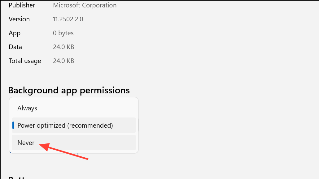 - Under Background app permissions, set the dropdown to Never.