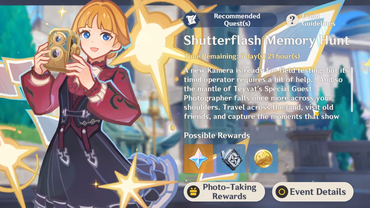Shutterflash Memory Hunt is a limited-time photography event in Genshin Impact Version 6.3 “Luna IV.” Over eleven days, you travel across Teyvat with a new Kamera, recreating specific character poses and camera angles to unlock Primogems, Mora, EXP books, and Talent Level-Up materials.