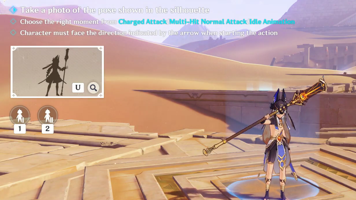 Step 1: Stand Cyno on the desert marker and face the arrow toward the distant ruins.