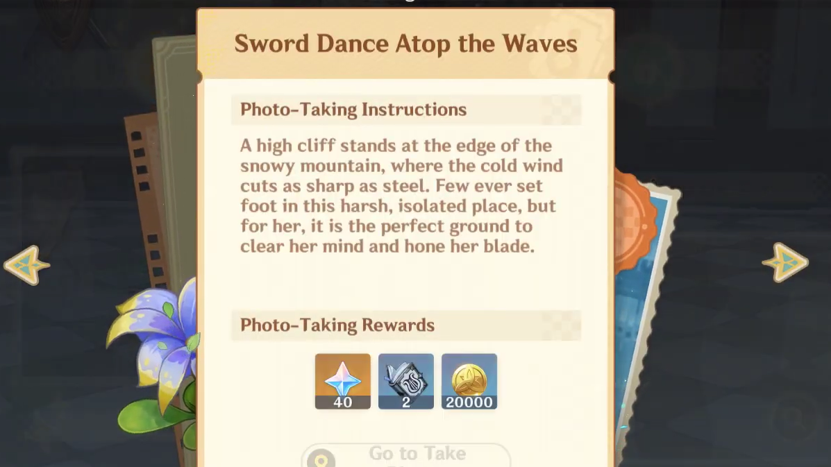| Unlock quest | Primogem ×20, Mora ×20,000, Adventurer’s Experience ×8, event-exclusive Kamera |