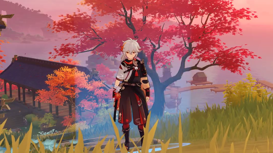 Step 1: Align Kazuha with the blue arrow on the ground, facing out toward the water and maples.