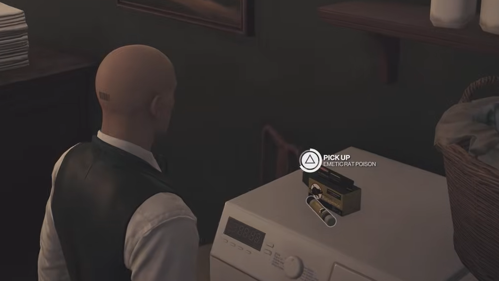 Step 4: Head through the nearby bathroom. On the washing machine, you'll find rat poison — grab it. There's no lethal poison readily available on this map, but rat poison is all you need to lure Devo away from the crowd.
