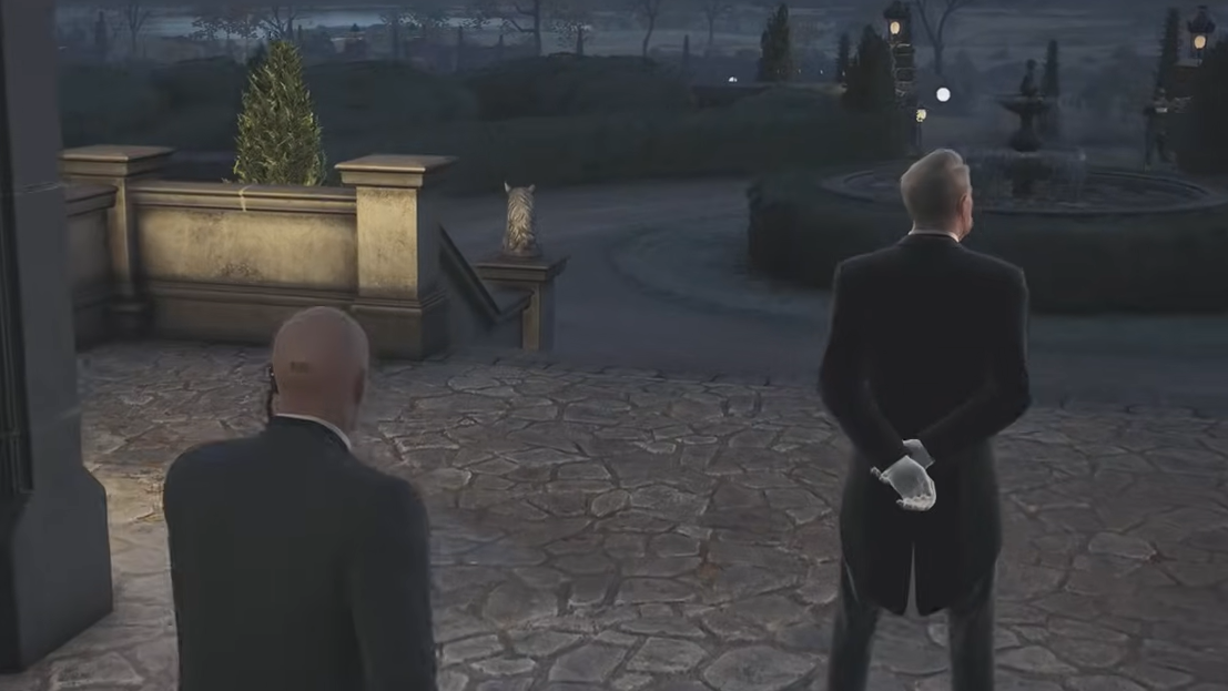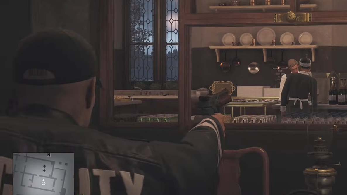 Step 6: While waiting, head upstairs to a second-floor NPC and knock him out. Take his disguise — it has only one enforcer on the entire map (the butler), making it extremely powerful for moving freely. You can also swap back to your suit to avoid enforcers altogether, though you'll need the better disguise for the next part.